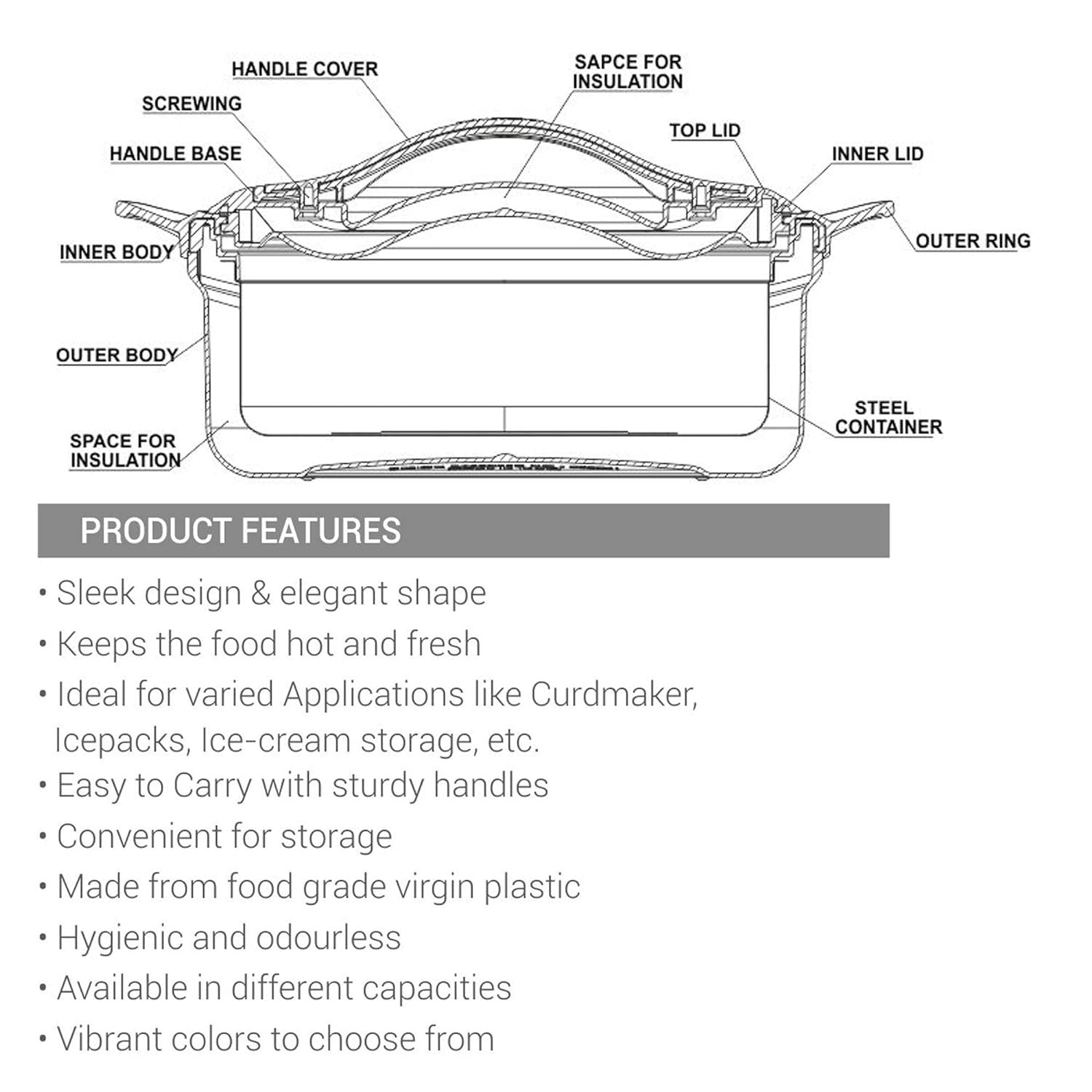 Double Walled Insulation: Inner stainless steel layer retains heat effectively, keeping food hot and fresh for long hours.