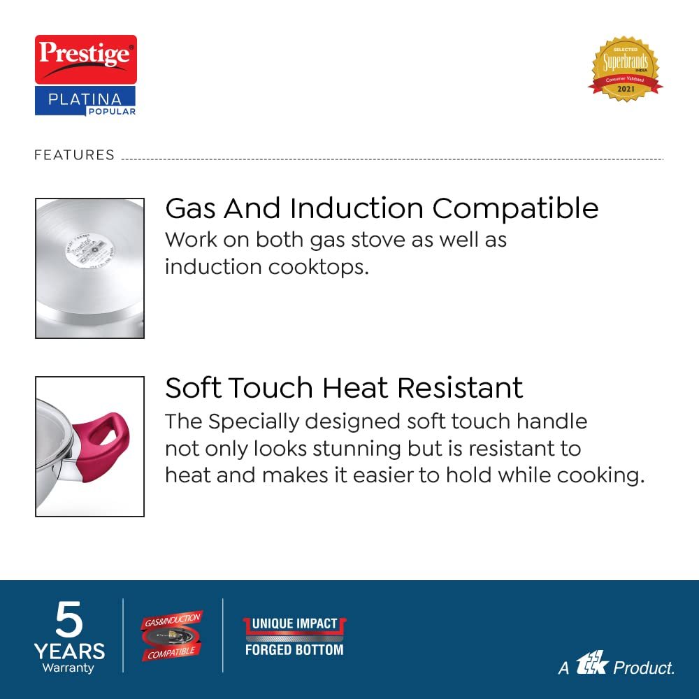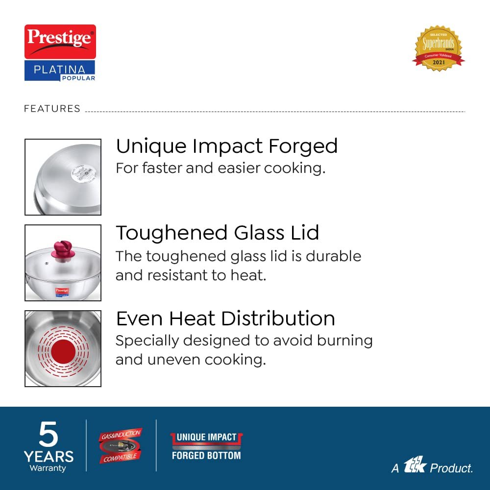 The Prestige Platina Popular Kadai is a durable and stylish stainless steel cookware piece designed for efficient and even cooking on different heat sources.