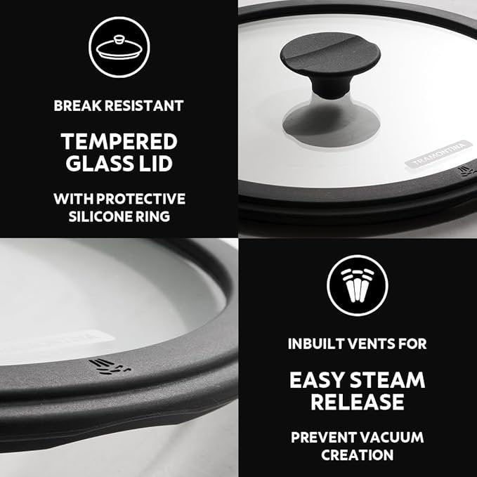 Convenient Glass Lid Design: Features a toughened glass lid with a silicone ring and steam vent for easy monitoring and moisture control.